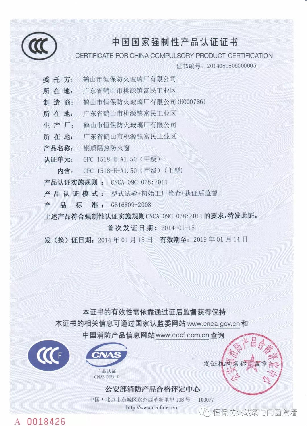 4.恒保公司一共12個(gè)產(chǎn)品獲得國(guó)家3C認(rèn)證證書,2小時(shí)和3小時(shí)鋼質(zhì)隔熱防火窗更是國(guó)家首個(gè)通過(guò)國(guó)家認(rèn)證的產(chǎn)品;