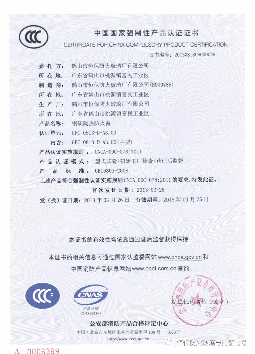 5、恒保公司一共6個(gè)產(chǎn)品獲得國(guó)家3C認(rèn)證證書,其中大版面玻璃防火門2100mmX3000mm;