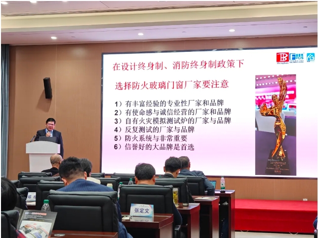 恒保董事長陳沃林先生在論壇上分享報告《高品質(zhì)防火玻璃及其在超高層建筑核心筒中的應(yīng)用》,從正確認(rèn)識防火玻璃、什么是高品質(zhì)防火玻璃、高層建筑消防當(dāng)前趨勢以及高品質(zhì)防火玻璃系統(tǒng)在高層建筑中的應(yīng)用四個方面介紹防火玻璃系統(tǒng)產(chǎn)品在高層建筑消防的作用,并分享如何正確選擇防火玻璃系統(tǒng)產(chǎn)品的經(jīng)驗,讓高層建筑更加美觀實用的同時,避免出現(xiàn)火災(zāi)時“防火玻璃”不防火的現(xiàn)象。陳沃林先生呼吁大家共同抵制假冒偽劣防火玻璃產(chǎn)品,對建筑消防安全負(fù)責(zé)、對生命安全負(fù)責(zé)。